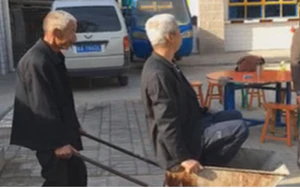 一老汉坐在手推车上被另一老汉推向九人队列“检阅”。