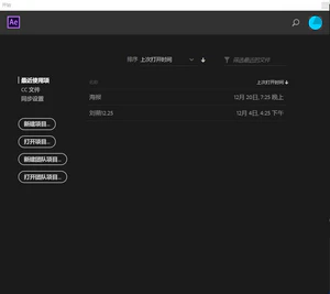 打开 AE 时,会出现如右图的新建项目窗口。对于有一些配置稍差电脑,加载这一窗口可能需要时间,此时请耐心等待。 这是一窗口可显示关于新建合成项目的一些信息,包括新建工程,打开工程还有陈列在右侧的历史工程列表。